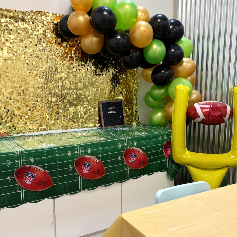 Full party decor, including balloon garland